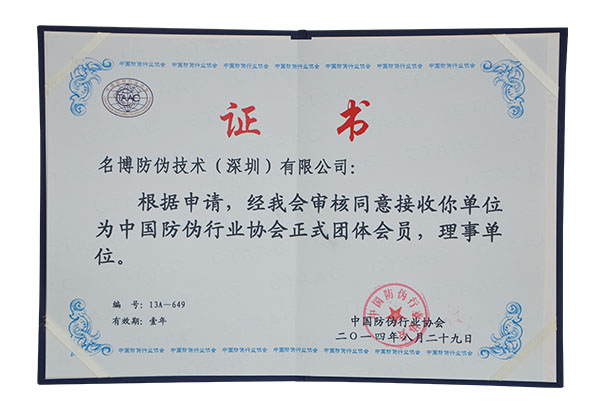 名博公司于1993年成立,是亞太防偽協(xié)會(huì)會(huì)員、中國(guó)防偽協(xié)會(huì)理事單位。公司集研發(fā)、生產(chǎn)、銷(xiāo)售為一體,專(zhuān)業(yè)提供各種防偽油墨、防偽材料、防偽制品,是中國(guó)知名防偽產(chǎn)品制造商之一。